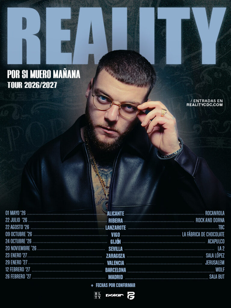 COMING SOON Reality Tour 2026 9 OCTUBRE 2026 VIGO LA FÁBRICA DE CHOCOLATE Comprar Entradas 24 OCTUBRE 2026 GIJÓN ACAPULCO Comprar Entradas 20 NOVIEMBRE 2026 SEVILLA LA 2 Comprar Entradas 23 ENERO 2027 ZARAGOZA LÓPEZ Comprar Entradas 29 ENERO 2027 VALENCIA JERUSALEM Comprar Entradas 12 FEBRERO 2027 BARCELONA WOLF Comprar Entradas 26 FEBRERO 2027 MADRID SALA BUT Comprar Entradas